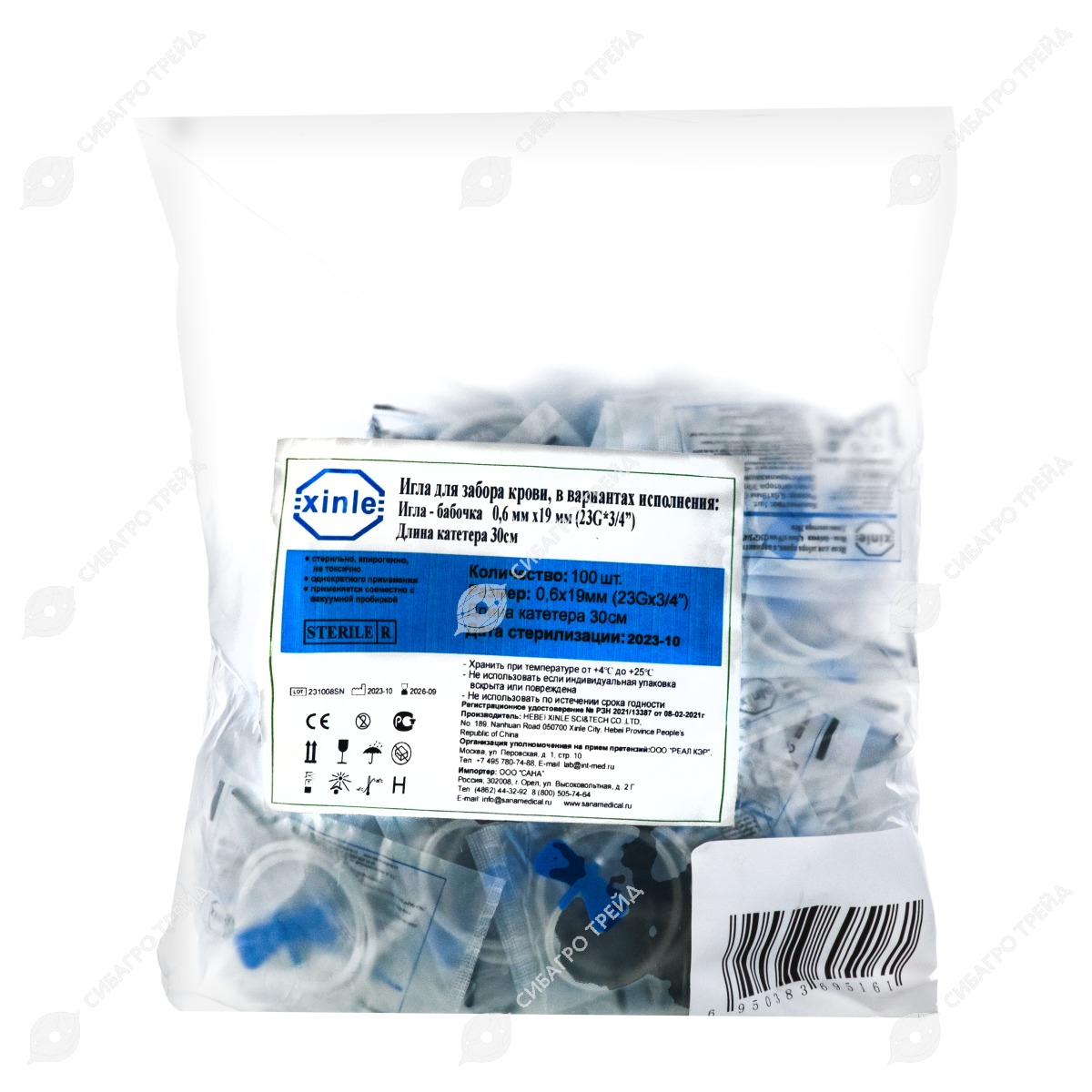Игла-бабочка внутривенная, соединение для пробирок 23G (0,6 * 19 мм), длина 30 см, 100 шт