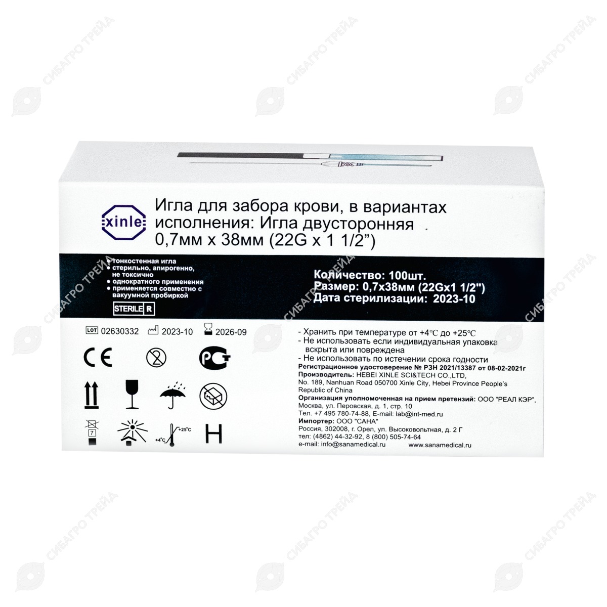 Игла для забора крови (22G) 0,7 * 38 мм двусторонняя для вакуумной пробирки.