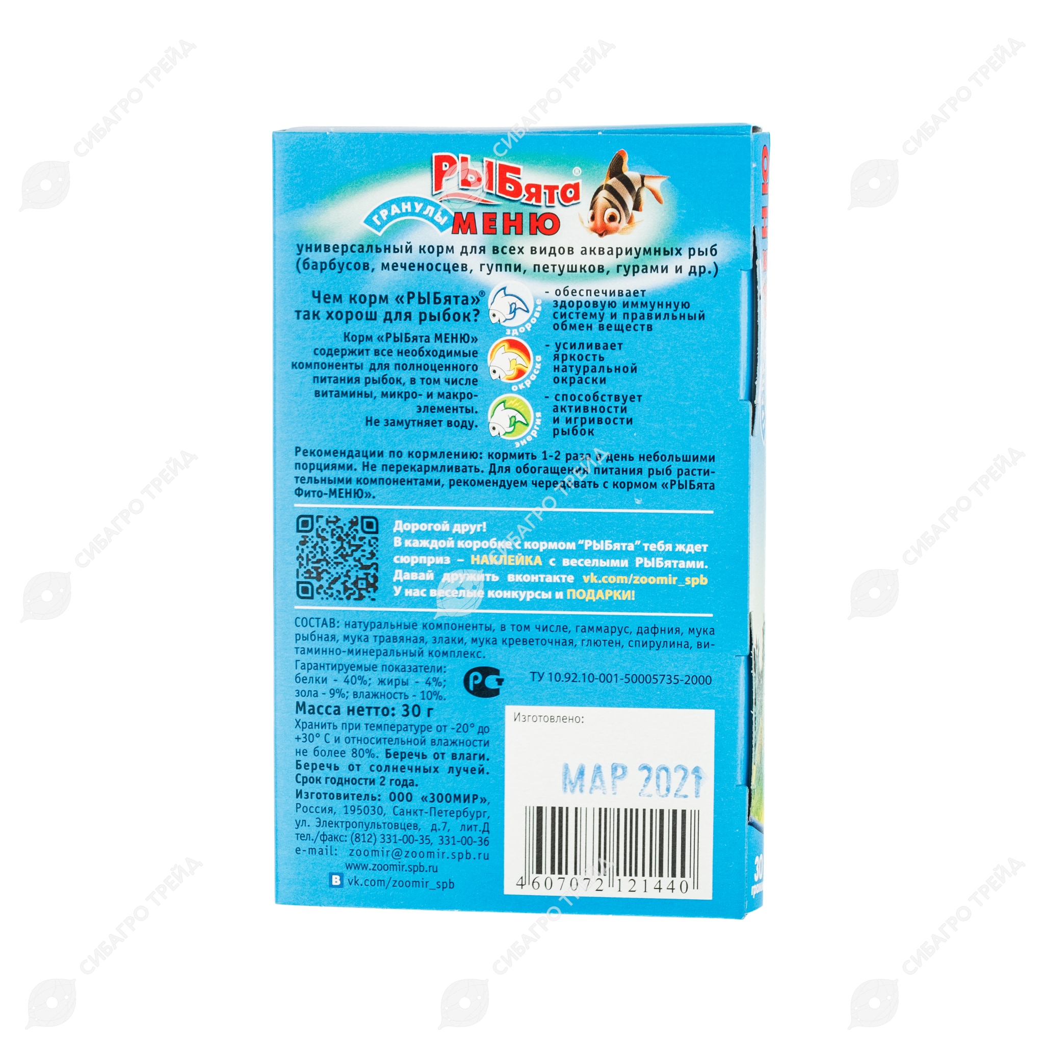 Корм "РЫБята МЕНЮ" содержит все необходимые компоненты полноценного питания рыбок, в том числе витамины, микро- и макроэлементы. Не замутняет воду.