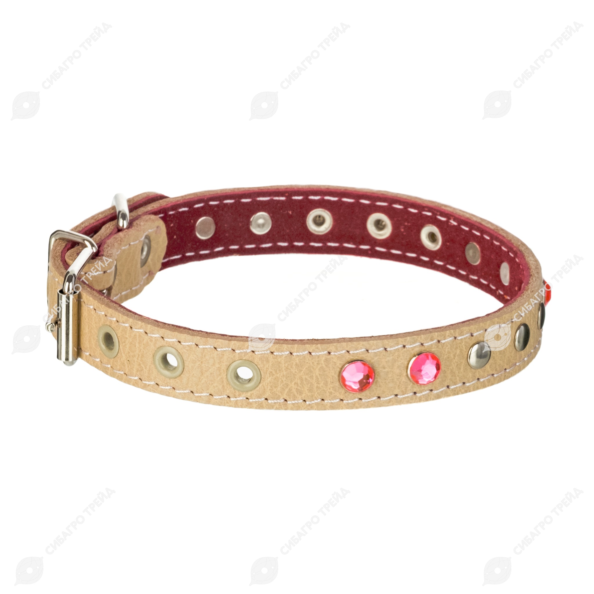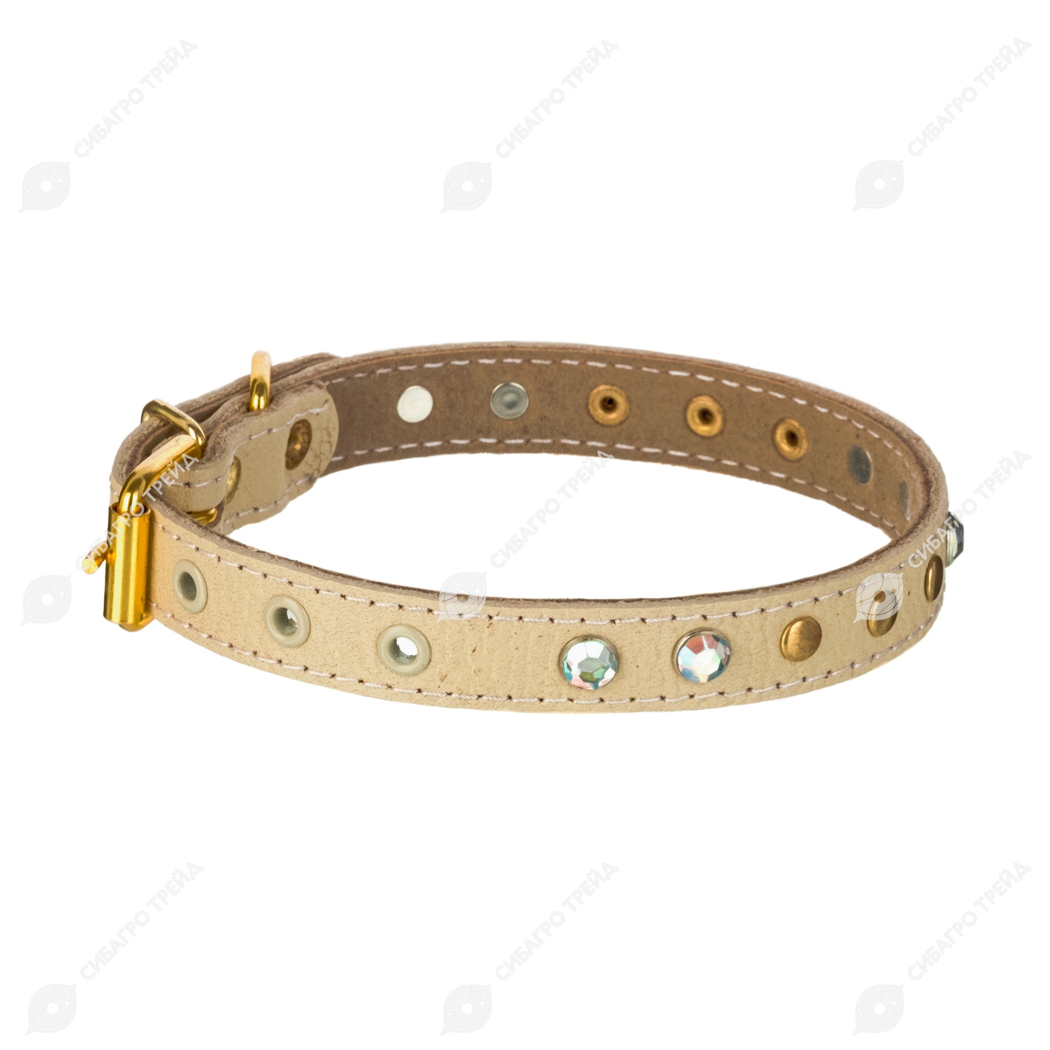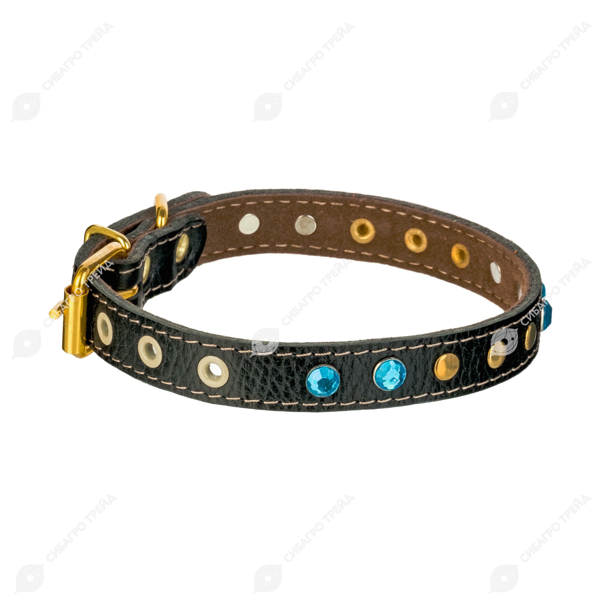 Ошейник выполнен из кожи, предназначен для собак. Надёжно застегивается на небольшую металлическую пряжку, украшен по всей длине стразами и имеет подклад. Размер ошейника можно регулировать.