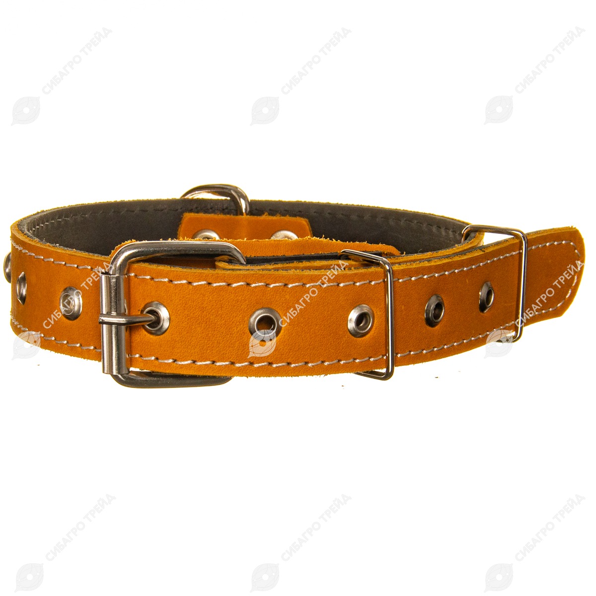 Цветной ошейник: верхний слой - натуральная кожа с украшениями, нижний - брезент. Прошит декоративной строчкой, снабжен металлически наконечником, отверстия укреплены металлической блочкой, полукольцо у пряжки.