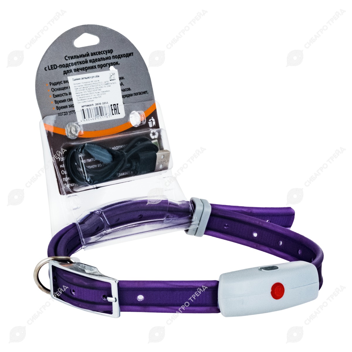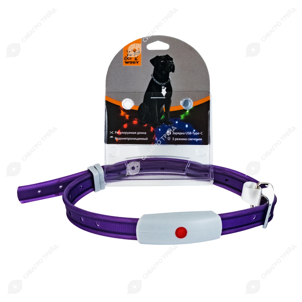 Ошейник WOGY светящийся (ОШ до 69 см) с застежкой, влагостойкий, фиолетовый, 3 режима
