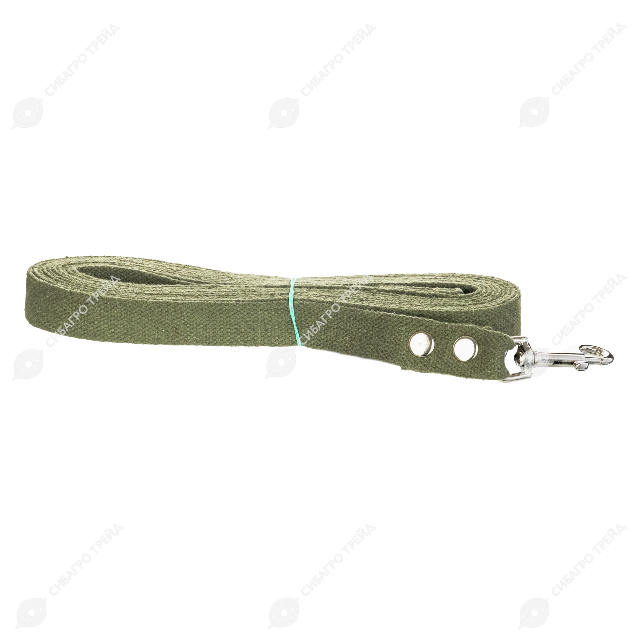 Поводок из брезентовой ленты с карабином. Материал поводка - хлопок. Толщина (мм): 2,5 ± 0,3. Разрывная нагрузка: 200 кгс. Цвет хаки.