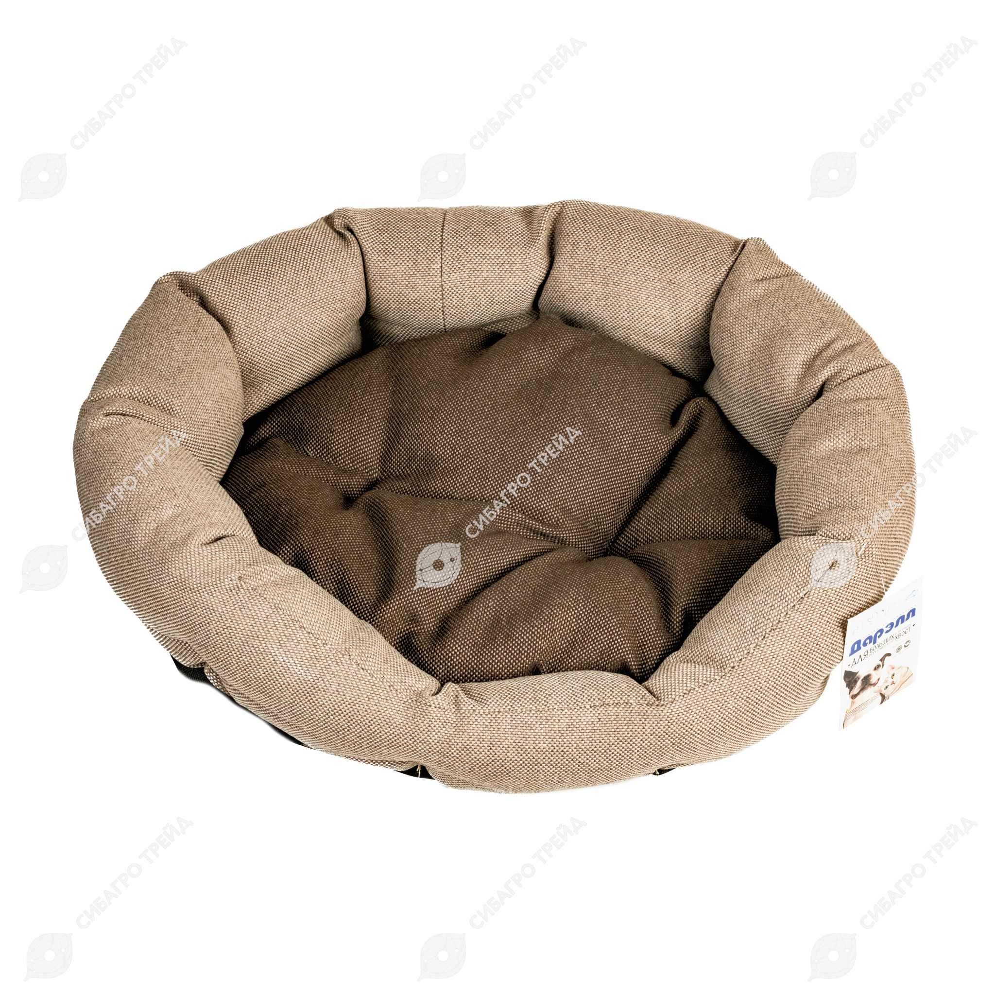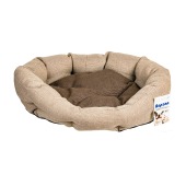 Уютный овальный лежак из стильного на вид мебельного материала с пухлыми бортами и подушкой, набитыми синтепухом. Снизу донышко имеет нескользящее покрытие в виде резиновых пупырышек. Лежак производится в 3 размерах и в 2-х скомпанованных между собой цветах. Основным из которых является коричневый с дополняющим его бежевым цветом. Лежак предназначен для кошек или небольших собак. Изделие можно подвергать машинной стирке в режиме шерсть" при температуре до 30°С."