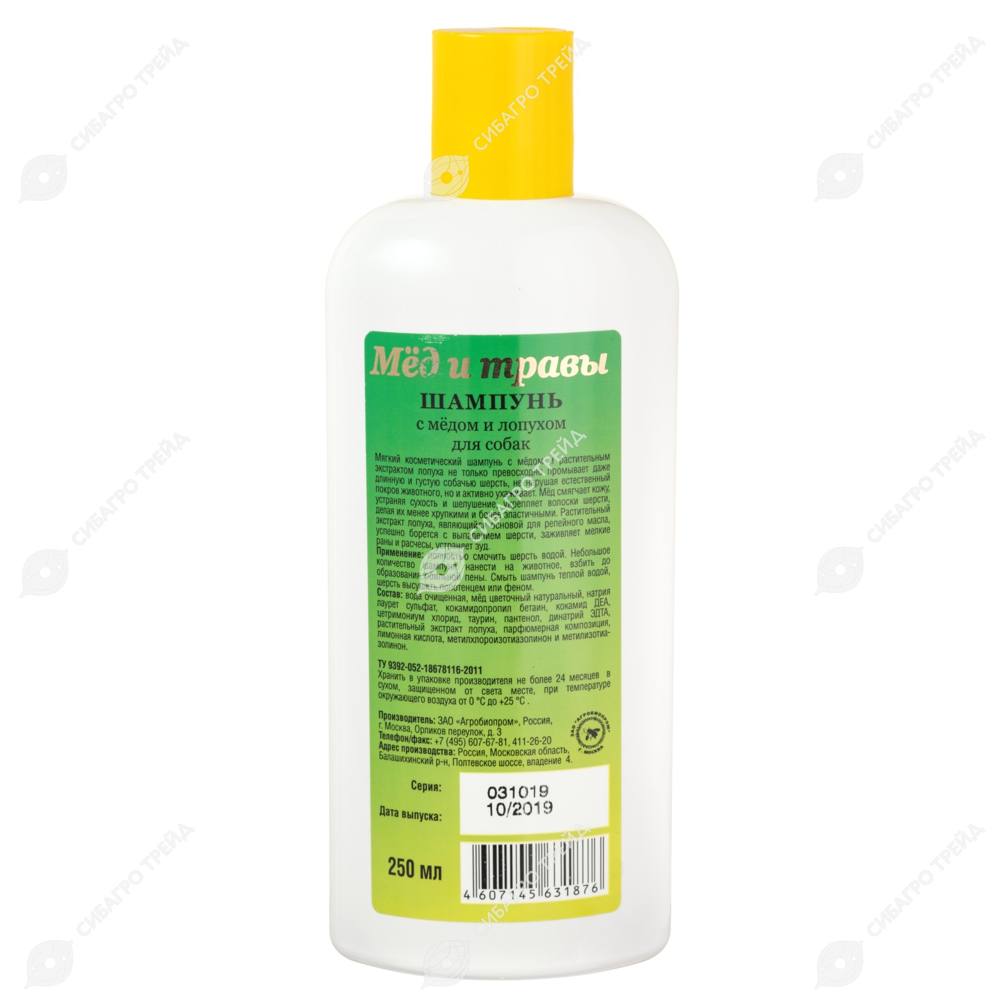 Серия косметических мягких шампуней Мед и травы для животных (собак и кошек) специально разработана для ежедневного ухода за шерстью и кожей. Добавление натурального меда и экстрактов трав в состав шампуней позволяет превосходно промывать длинную и густую шерсть, устранять неприятный запах, укреплять шерстный покров и сокращать период линьки у животного. Шампуни глубоко увлажняют, смягчают и питают кожу животного, устраняют сухость и шелушения, помогают восстановить защитный слой. Натуральные компоненты косметических шампуней серии Мед и травы позволяют применять их для животных с чувствительной кожей, склонной к аллергическим реакциям, а также щенкам и котятам. Шампунь с медом и лопухом рекомендован для собак в период линьки и при чрезмерном выпадении шерсти. Входящий в состав натуральный экстракт лопуха помогает укрепить волосяные луковицы, увлажнить и смягчить шерсть животного.