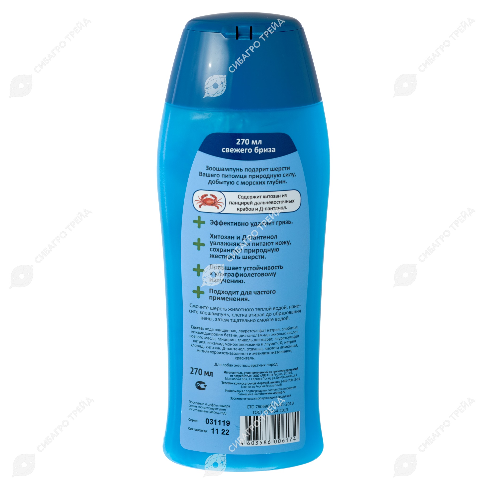 В состав зоошампуней «МОРСКОЙ» входит уникальный природный полисахарид, полученный из панцирей дальневосточных крабов – хитозан, который является прекрасным природным кондиционером. Хитозан образует влагоудерживающее покрытие, за счет чего увлажняет кожу и шерсть, защищает от агрессивных факторов внешней среды, повышает устойчивость к ультрафиолетовому излучению. Хитозан абсолютно не токсичен, не накапливается на шерсти, безвреден для особо чувствительной кожи, а также обладает мягким антибактериальным действием, снимает электростатический заряд, придает блеск и улучшает расчесывание.