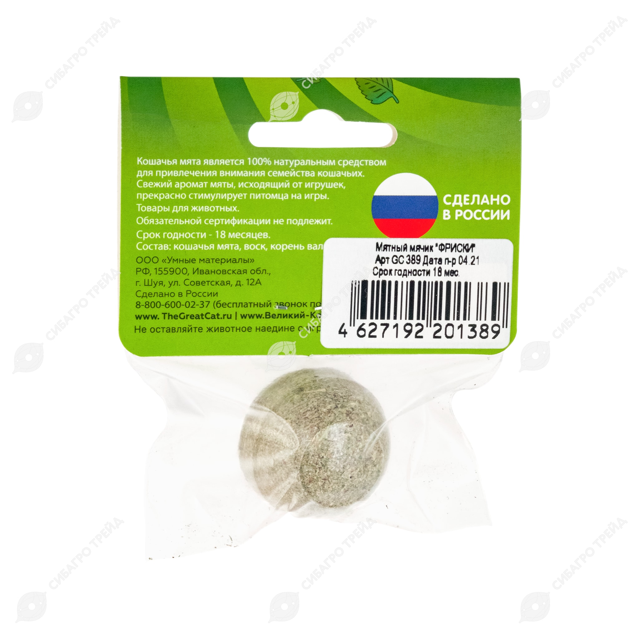 ВЕЛИКИЙ КОТ мячик фриски МЯТНЫЙ (кошачья мята, корень валерьяны, лаванда), 22 г