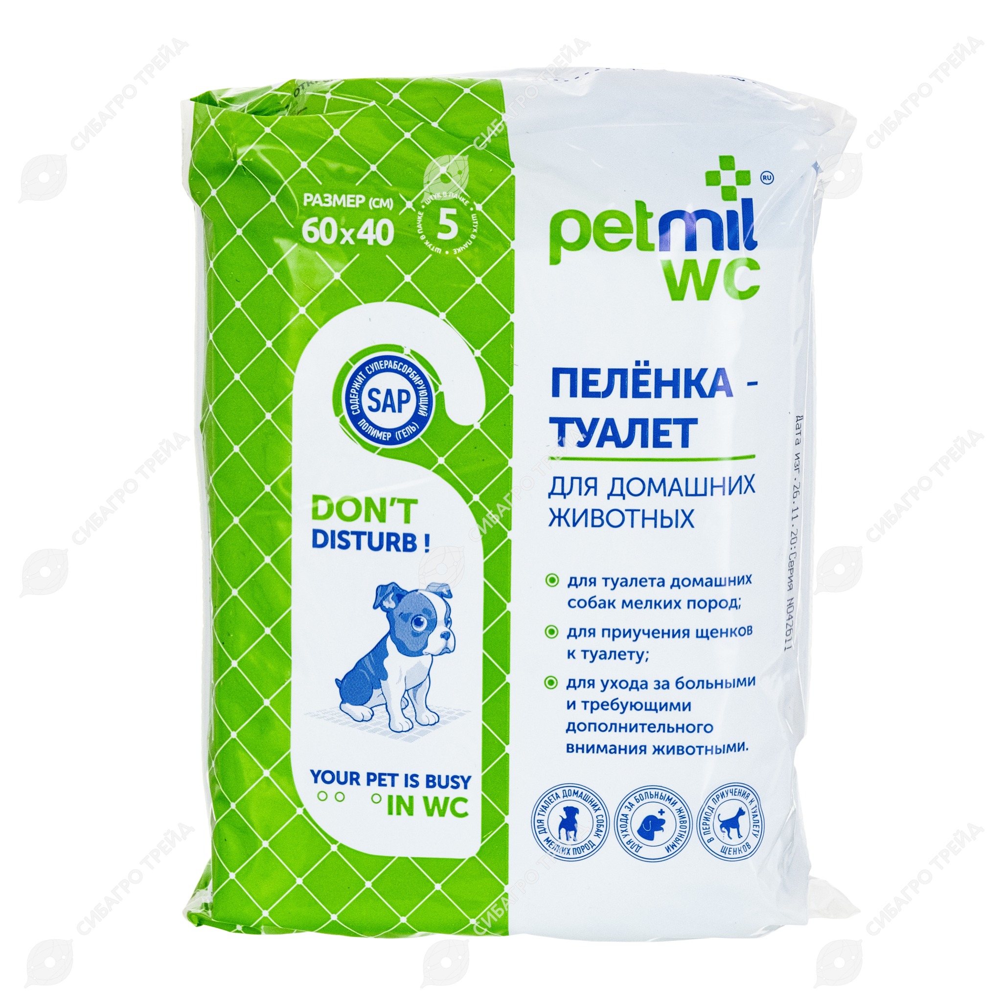 Впитывающая пятислойная пелёнка. Помогает поддерживать чистоту места кормления и туалета животного, необходима в поездке, при походе к ветеринару. Особенность конструкции: впитывающий Специально разработана как туалет для домашних собак мелких пород. Особенность конструкции: дополнительно содержит суперабсорбирующий полимер (SAP), который связывает жидкость в виде геля, блокируя неприятные аммиачные запахи. Пелёнка-туалет «работает» несколько дней, не теряя своих свойств. Удобна она и для приучения щенков, для ухода за больными, кормящими животными. Может применяться вместе со специальными лотками, в переносках и клетках.