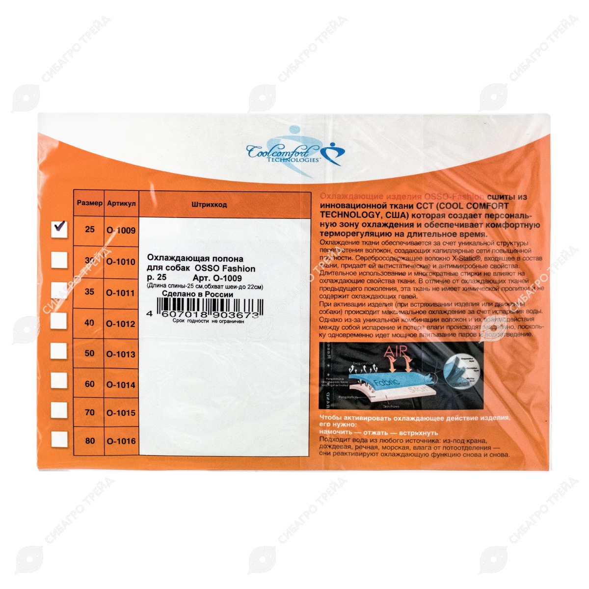 Охлаждающие изделия OSSO Fashion сшиты из инновационной ткани ССТ (COOL COMFORT TECHNOLOGY, США), которая создает персональную зону охлаждения и обеспечивает комфортную терморегуляцию на длительное время .