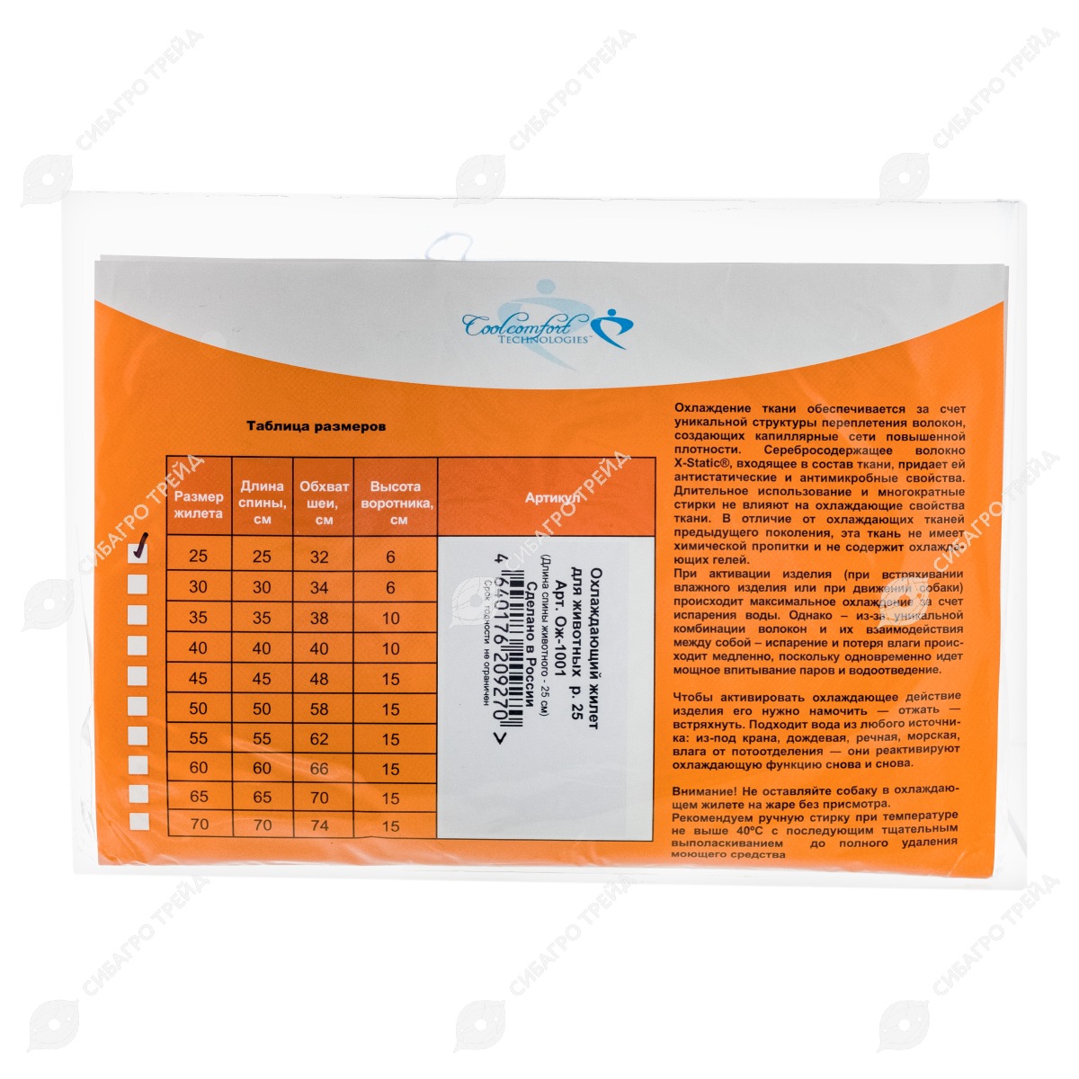 Жилет охлаждает шею, спину и грудь собаки, одевается через голову и фиксируется на талии с помощью стропы с застежкой фастекс, что позволяет фиксировать жилет на корпусе и регулировать размер.