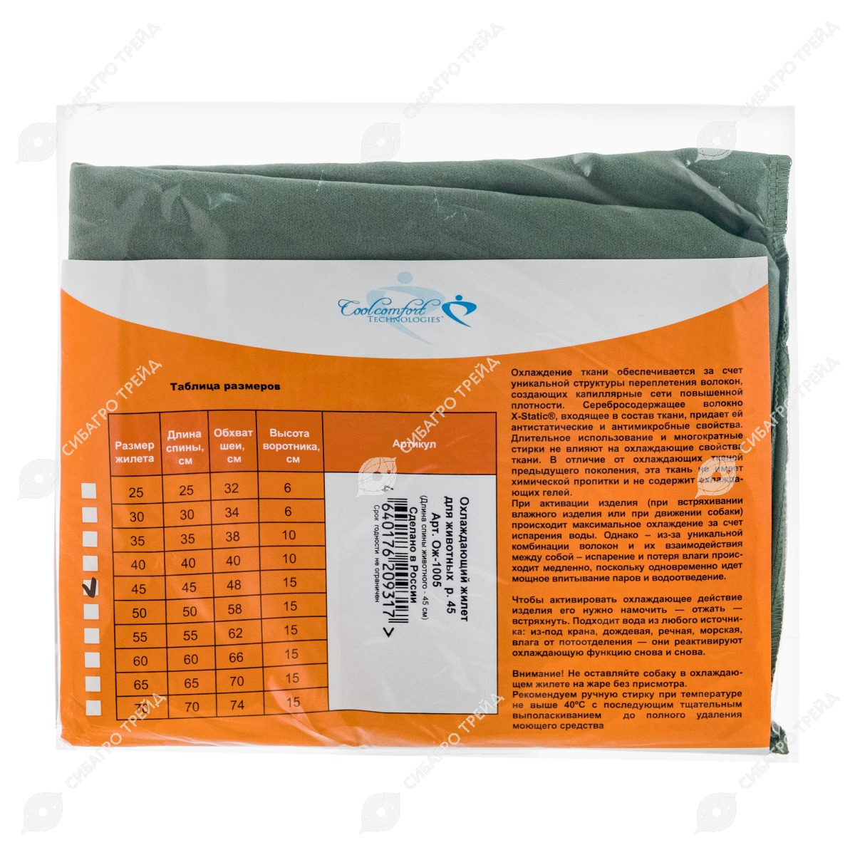 Охлаждающий жилет из ткани ССТ (COOL COMFORT TECHNOLOGY, США) позволяет собакам легче переносить жару, делает более комфортным их пребывание на солнце во время прогулки, в транспорте и на выставках, проходящих на открытом воздухе или в душных помещениях. Охлаждение ткани обеспечивается за счет уникальной структуры переплетения волокон, создающих капиллярные сети повышенной плотности. Серебросодержащее волокно X-Static, входящее в состав ткани, придает ей антистатические и антимикробные свойства. Длительное использование и многократные стирки не влияют на охлаждающие свойства ткани. В отличие от охлаждающих тканей предыдущего поколения, эта ткань не имеет химической пропитки и не содержит охлаждающих гелей.