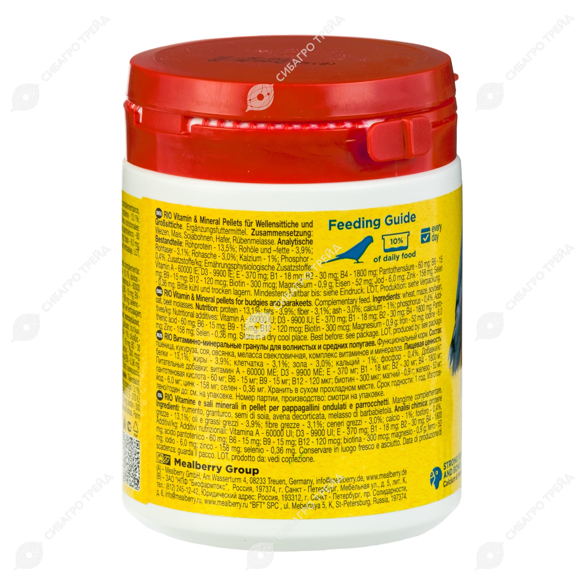Птицы в домашних условиях часто испытывают недостаток витаминов и минеральных веществ. Например, витамин D3 вырабатывается в организме птиц только под действием ультрафиолета. Птицы, находящиеся в неволе, из-за недостатка солнечного света не могут синтезировать достаточное количество витамина D3 самостоятельно. Витаминно-минеральные гранулы RIO содержат комплекс важнейших витаминов, микро- и макроэлементов, необходимых для полноценного питания и здоровья домашних птиц. Ежедневное применение функционального корма исключает появление неблагоприятных последствий при несбалансированном питании. Он способствует укреплению иммунитета, улучшению зрения и состояния кожи и перьев. Вес: 120г.