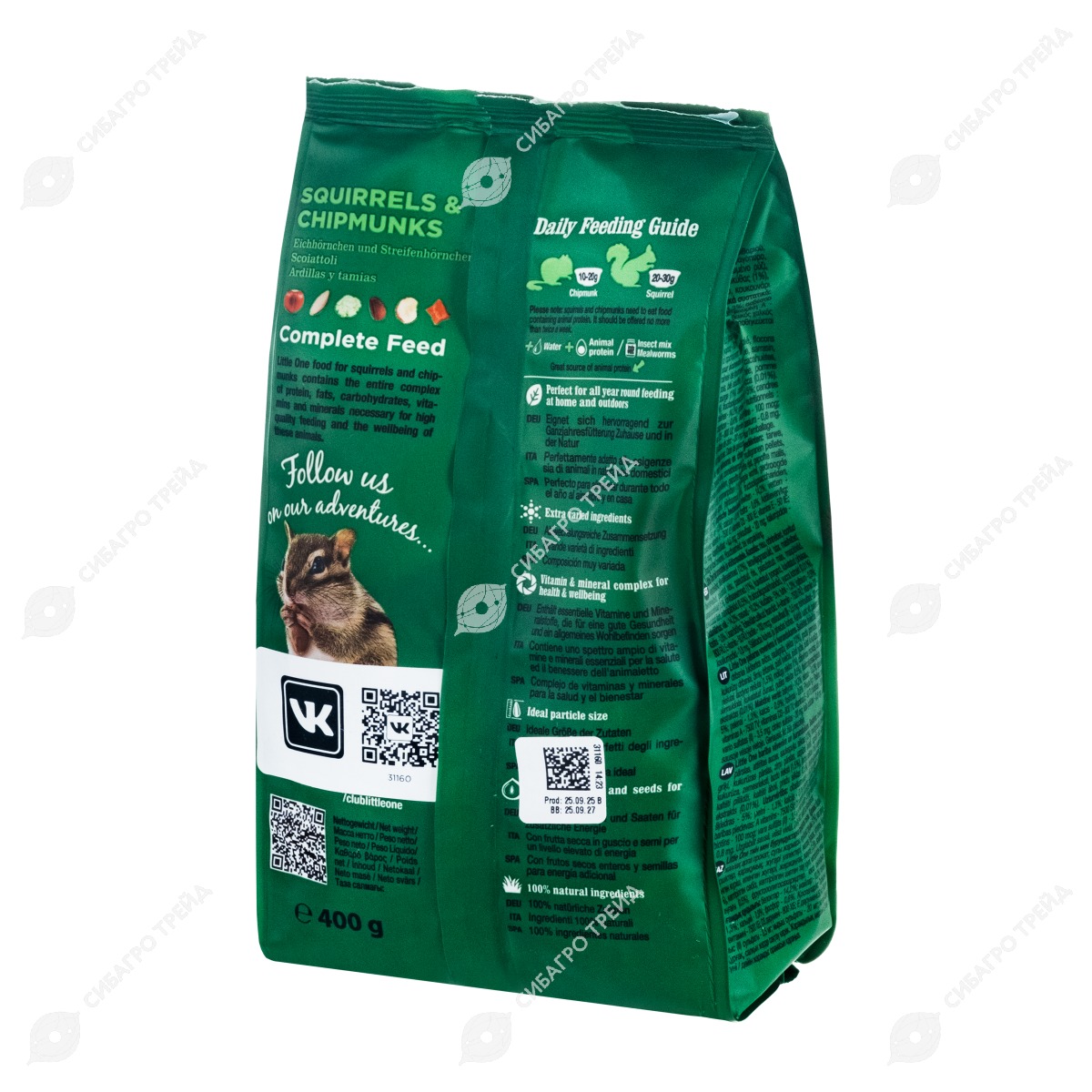 Корм учитывает все индивидуальные потребности белок и бурундуков, а размер ингредиентов подобран в соответствии с их размерами. Сбалансированный корм подойдет не только для домашних питомцев, но и для круглогодичного подкармливания животных в их естественной среде обитания.